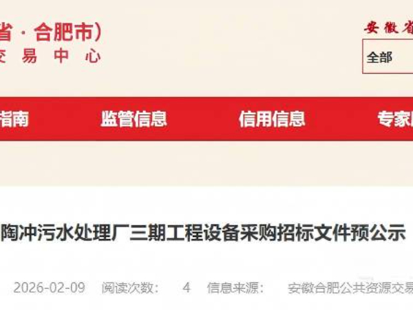 2月9日,合肥市陶冲污水处理厂三期工程设备采购招标文件预公示发布。