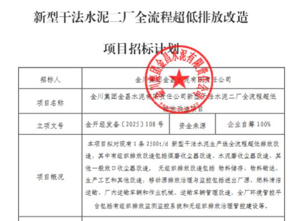 2月10日,金川集团金昌水泥有限责任公司新型干法水泥二厂全流程超低排放改造项目招标计划发布。