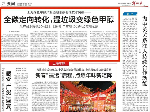昨天,上海市“沼气全碳定向转化制绿色甲醇关键技术与中试验证”项目关键节点推进汇报会在上海老港生态环保基地举行。巨大的千吨级中试装置,以湿垃圾为原料,生产绿色甲醇的成本比现有技术降低30%以上。市科委表示,这是颠覆性技术突破,为上海建设国际航运绿色燃料加注中心提供了坚实支撑。
