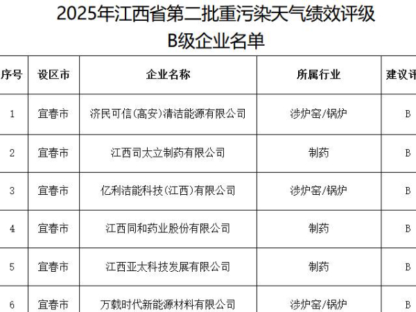 24家!2025年江西省第二批重污染天气绩效评级B级企业名单