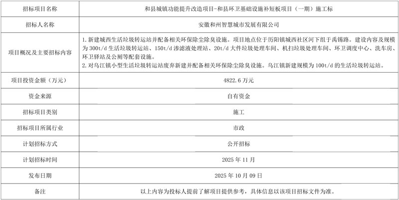 马鞍山市和县城镇功能提升改造项目-和县环卫基础设施补短板项目(一期)施工招标计划发布。