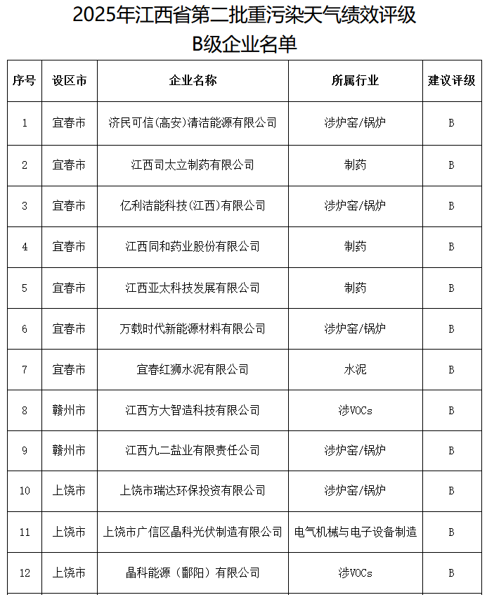 24家!2025年江西省第二批重污染天气绩效评级B级企业名单