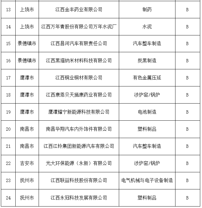 为积极有效应对重污染天气,贯彻落实生态环境部《关于印发<重污染天气重点行业应急减排措施制定技术指南(2020年修订版)>的函》(环办大气函〔2020〕340号)和江西省《关于印发<江西省重污染天气重点行业绩效分级指南(试行)>的通知》(赣环大气字〔2022〕156号)要求,江西省生态环境厅组织各地切实开展重污染天气重点行业应急减排清单制修订和绩效分级工作,经企业申报、县级初审、市级复审、省级审核,全省拟认定B级企业24家。详情如下: