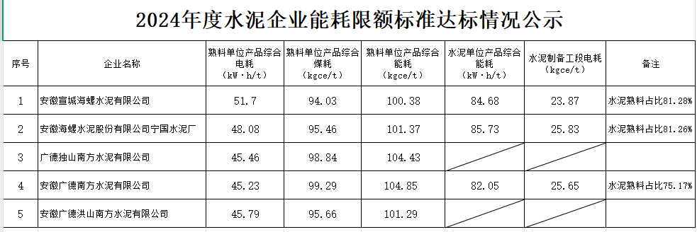 安徽宣城市2024年水泥企业、磷化工企业能耗限额标准达标公示