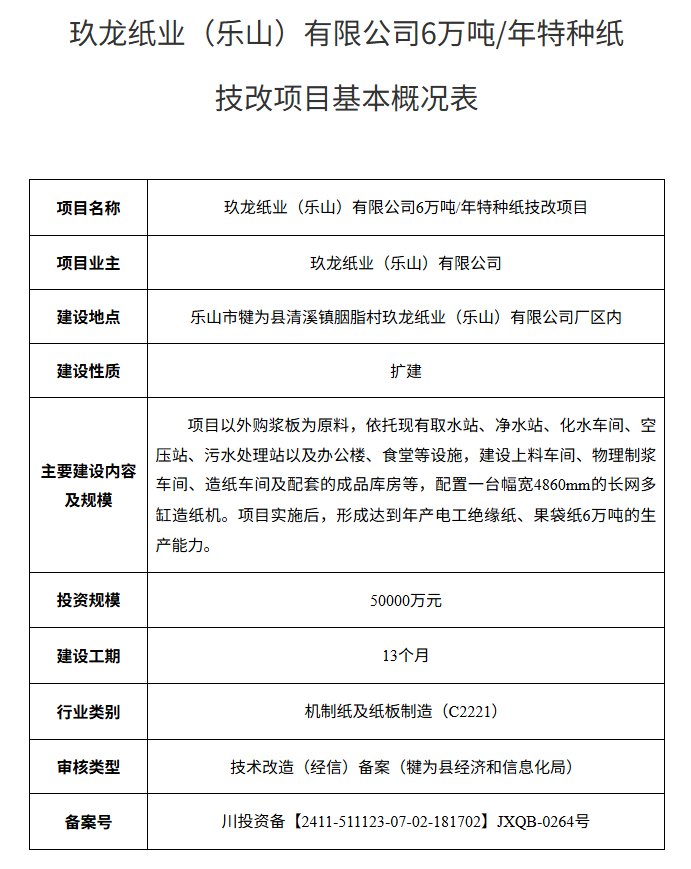 附件:玖龙纸业(乐山)有限公司6万吨/年特种纸技改项目基本概况表