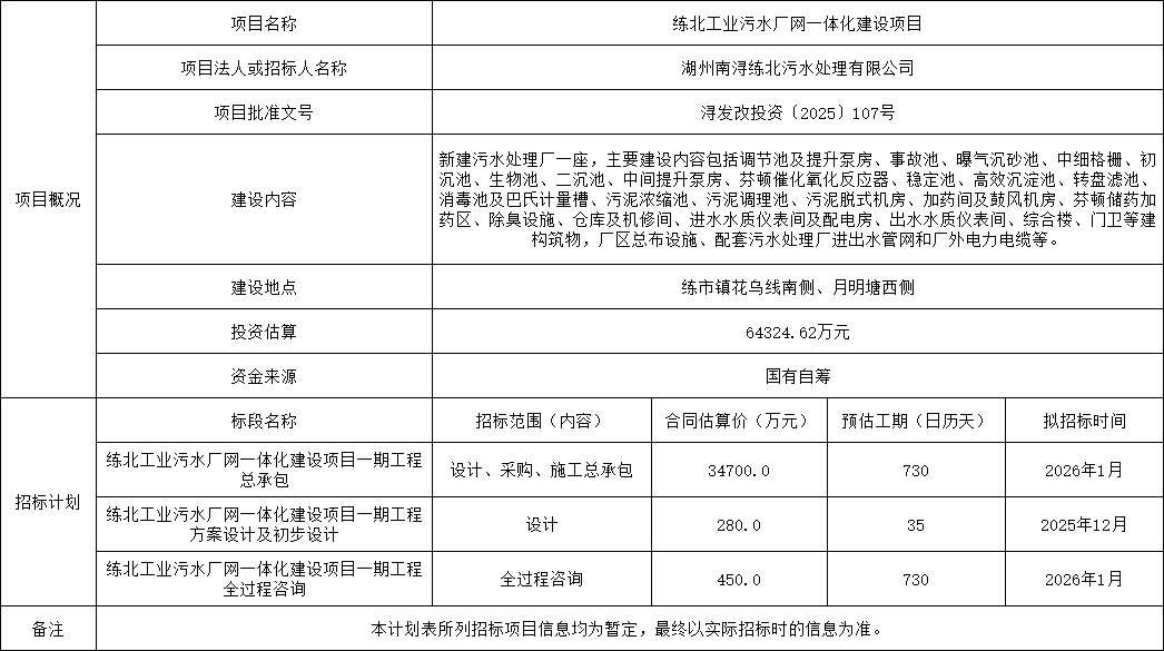 浙江省湖州南浔练北污水处理有限公司发布练北工业污水厂网一体化建设项目招标计划,该项目已获浔发改投资〔2025〕107号文件批准,现启动相关招标筹备工作。