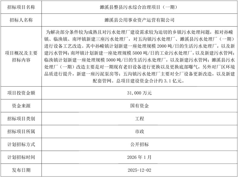 3.1亿!安徽濉溪县整县污水综合治理项目(一期)招标项目计划发布