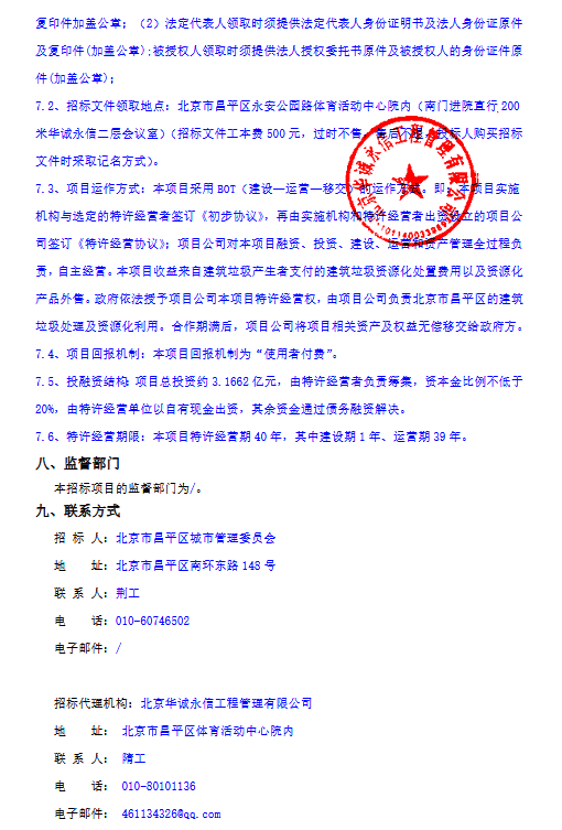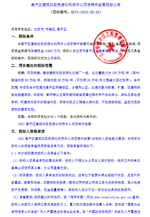 12月16日,北京市昌平区建筑垃圾资源化利用中心项目特许经营招标公告发布。
