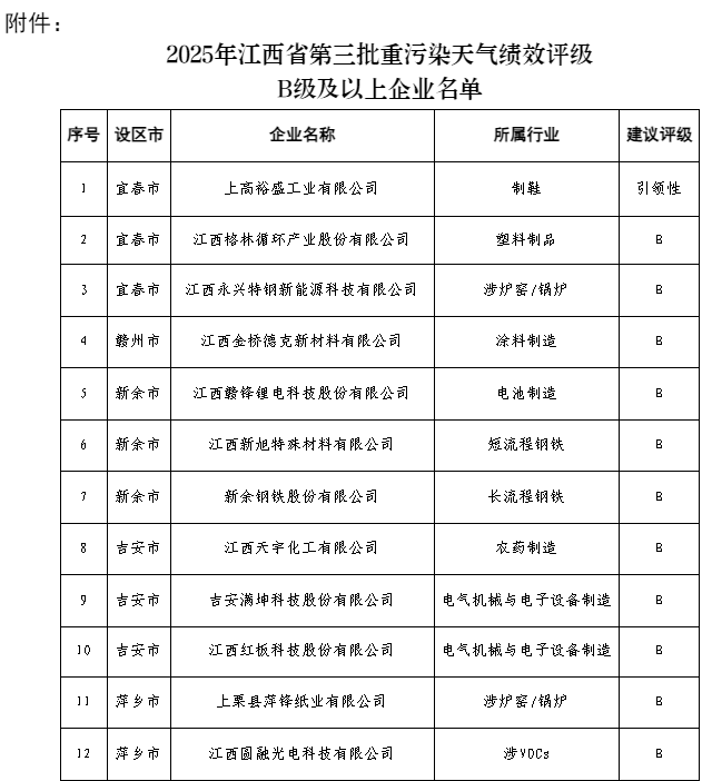 附件:2025年江西省第三批重污染天气绩效评级B级及以上企业名单