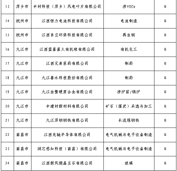 为积极有效应对重污染天气,贯彻落实生态环境部《关于印发<重污染天气重点行业应急减排措施制定技术指南(2020年修订版)>的函》(环办大气函〔2020〕340号)和我省《关于印发<江西省重污染天气重点行业绩效分级指南(试行)>的通知》(赣环大气字〔2022〕156号)要求,本着公开、公平、公正和透明的原则,我厅组织各地切实开展重污染天气重点行业应急减排清单制修订和绩效分级工作,经企业申报、县级初审、市级复审、省级审核,全省拟认定引领性企业1家,B级企业23家。现对重点行业企业绩效分级企业名单予以公示,接受公众监督。如对公示信息有异议,请在公示之日起7个工作日内,向省生态环境厅进行反馈。