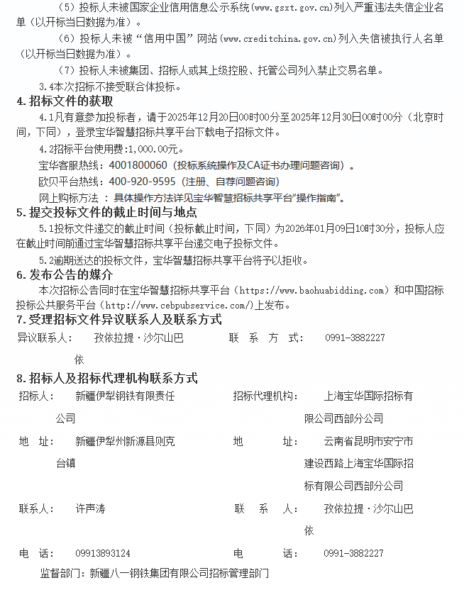 12月20日,伊犁钢铁1#、2#矿槽和 1#、2#出铁场除尘系统升级改造项目(EPC)招标公告发布。
