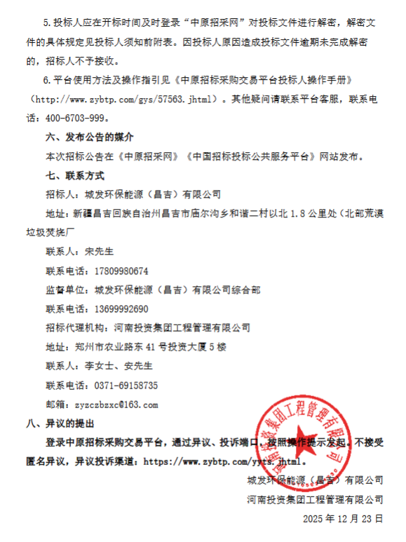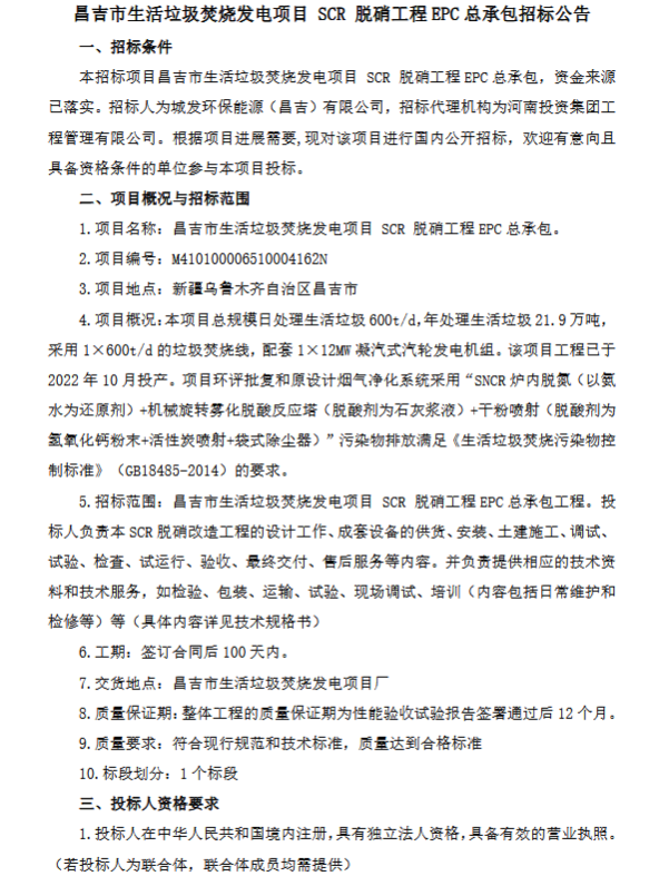 12月23日,昌吉市生活垃圾焚烧发电项目SCR脱硝工程EPC总承包公开招标公告发布。