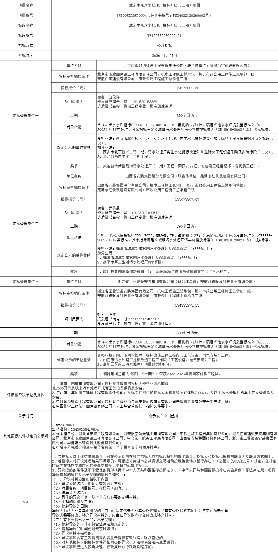 2026年1月29日,安徽省芜湖市城东生活污水处理厂提标升级(二期)项目定标候选人公示。