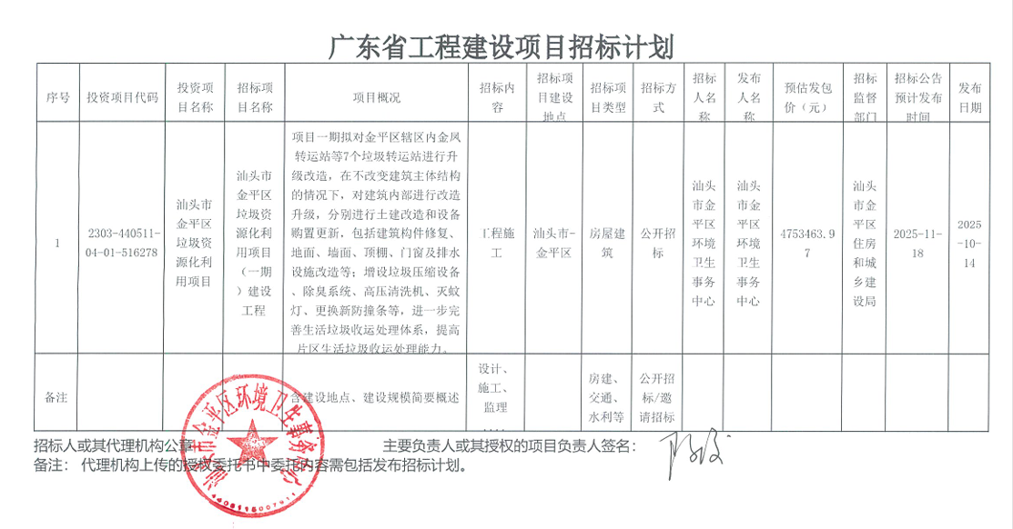 10月14日,广东省汕头市金平区垃圾资源化利用项目发布招标计划。