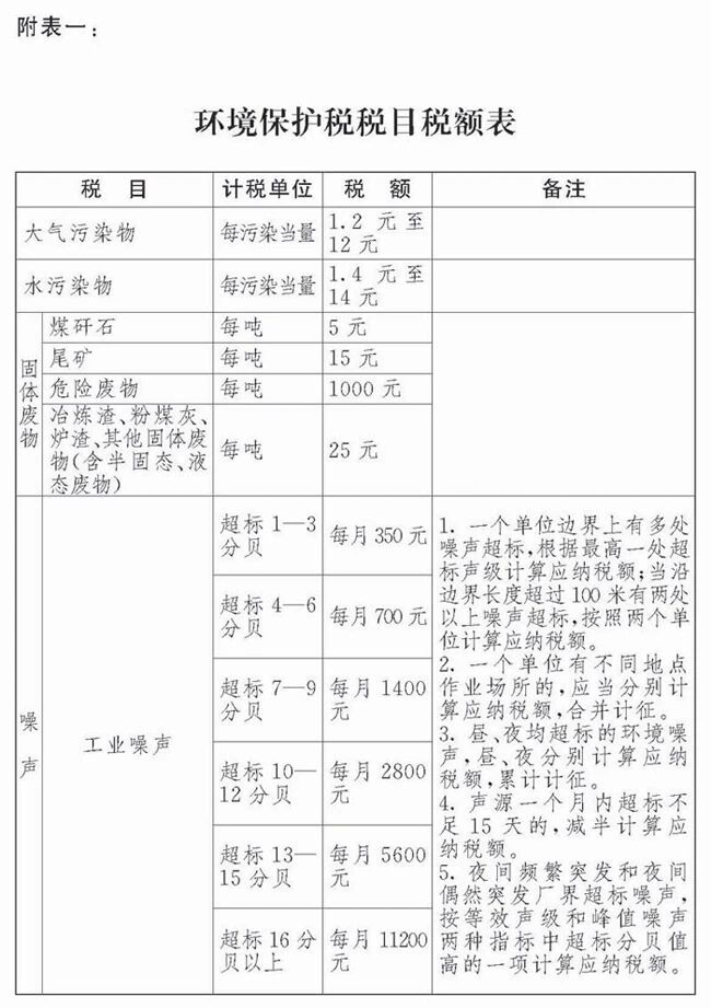 第六条 环境保护税的税目、税额,依照本法所附《环境保护税税目税额表》执行。