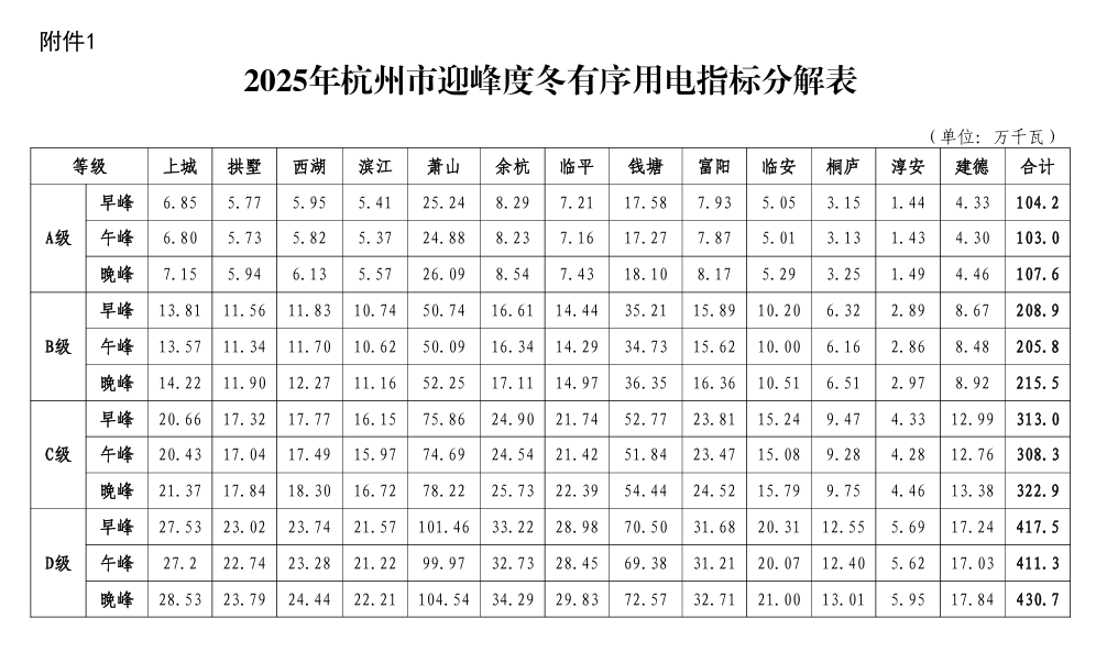 附件:1.2025年杭州市迎峰度冬有序用电指标分解表