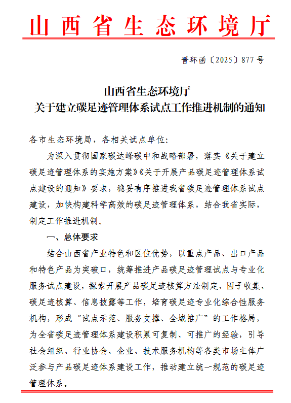 山西:关于建立碳足迹管理体系试点工作推进机制的通知