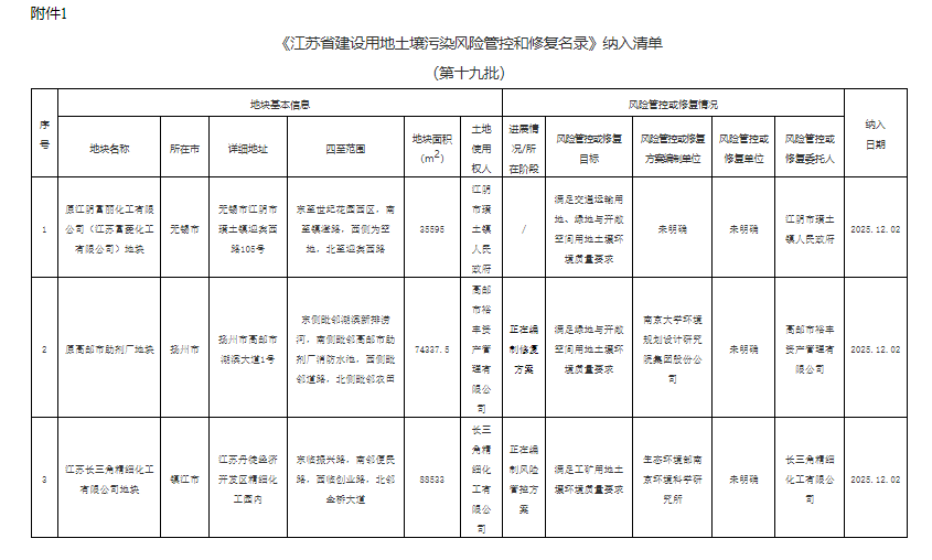 根据建设用地土壤污染风险评估情况,将无锡市原江阴富丽化工有限公司(江苏富菱化工有限公司)地块等3个地块新增纳入名录。
