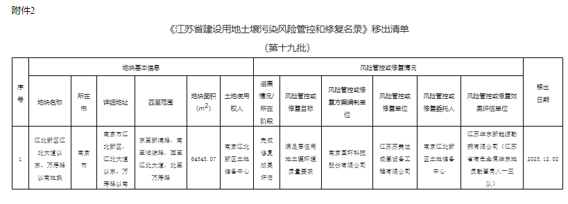 根据建设用地土壤污染修复效果评估情况,将南京市江北新区江北大道以东、万寿路以南地块移出名录。