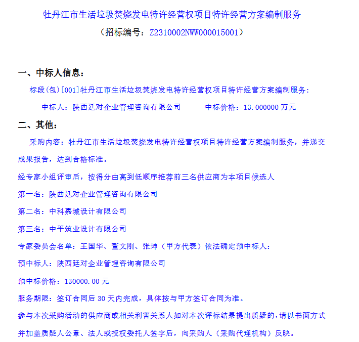 黑龙江省牡丹江市生活垃圾焚烧发电特许经营权项目特许经营方案编制服务中标