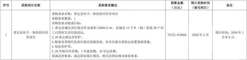 贵州省普定县环卫一体化特许经营项目政府采购意向公布,采购预算75752.81万元。