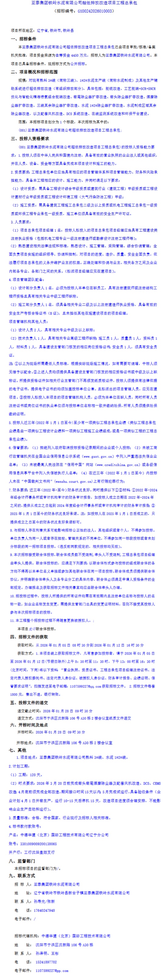 2026年1月5日,亚泰集团铁岭水泥有限公司超低排放改造项目工程总承包招标公告发布。