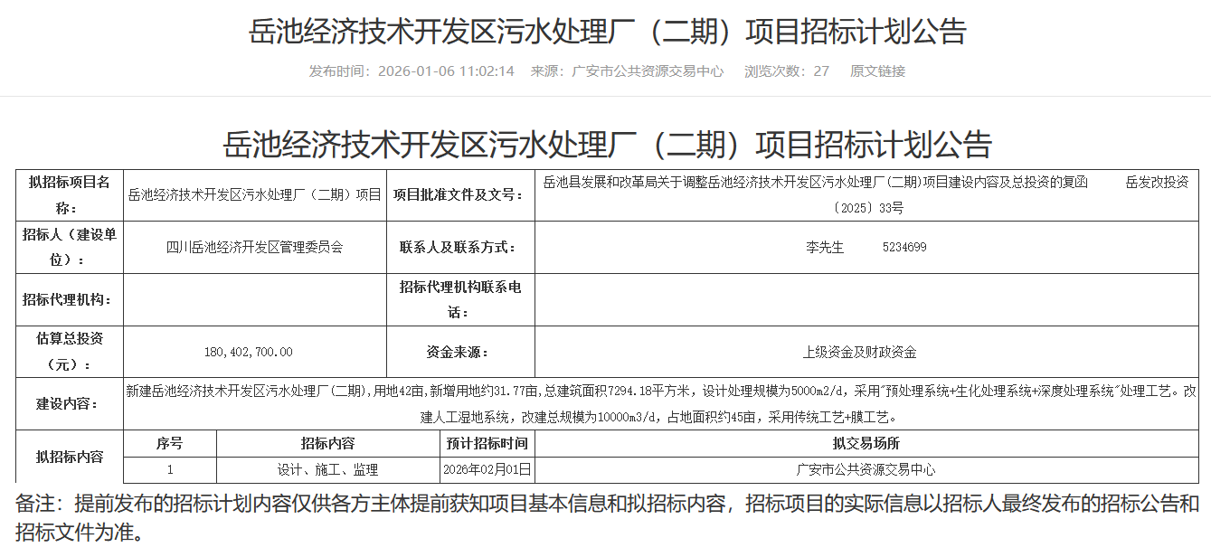 2026年1月6日,四川省岳池经济技术开发区污水处理厂(二期)项目招标计划公告发布。
