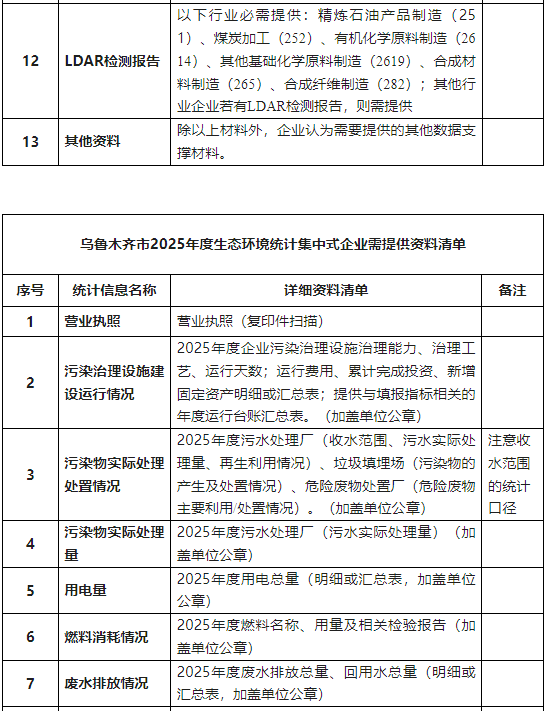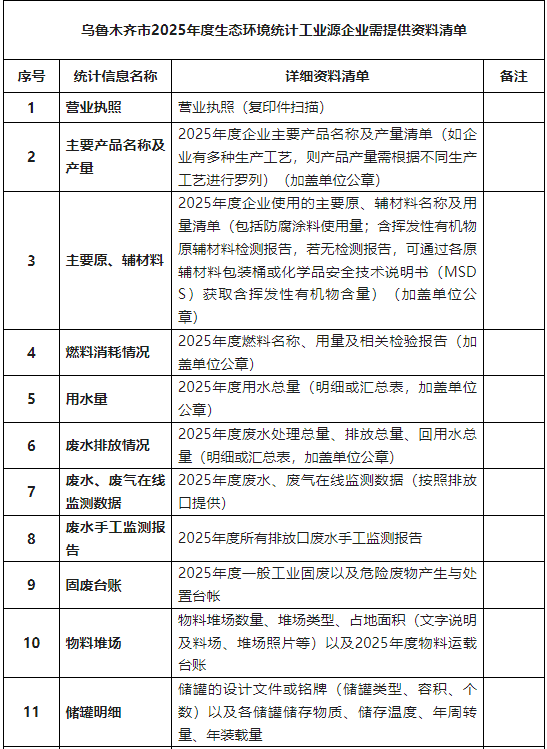 (四)准备数据支撑材料。填报过程中,要记录好数据的来源依据,并将有关支撑材料(参考乌鲁木齐市2025年生态环境统计档案材料清单)准备充分,生态环境部门将根据档案材料进行复核。