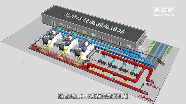 该项目创新性地将北京高碑店再生水厂排放的再生水作为热源,通过3台10.47兆瓦的热泵机组提取再生水中的余热,将热网回水从50摄氏度提升到57摄氏度,再通过两条DN1000的并热专线,直接补入北京市政供热回水管网。