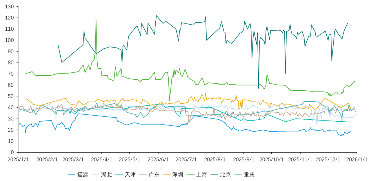 不同试点之间的价格分层依然明显。2025年均价最高的仍为北京,价格为96.53元/吨,上海均价为65.89元/吨,两者构成高价梯队;深圳均价为44.98元/吨处于中间水平;广东、重庆、天津、湖北均价集中在31—36元/吨区间,福建均价为20.60元/吨。最高与最低均价差为75.93元/吨,较2024年的79.17元/吨小幅收敛,试点间价格差距略有缩小,但高价市场与低价市场的梯度仍然清晰。