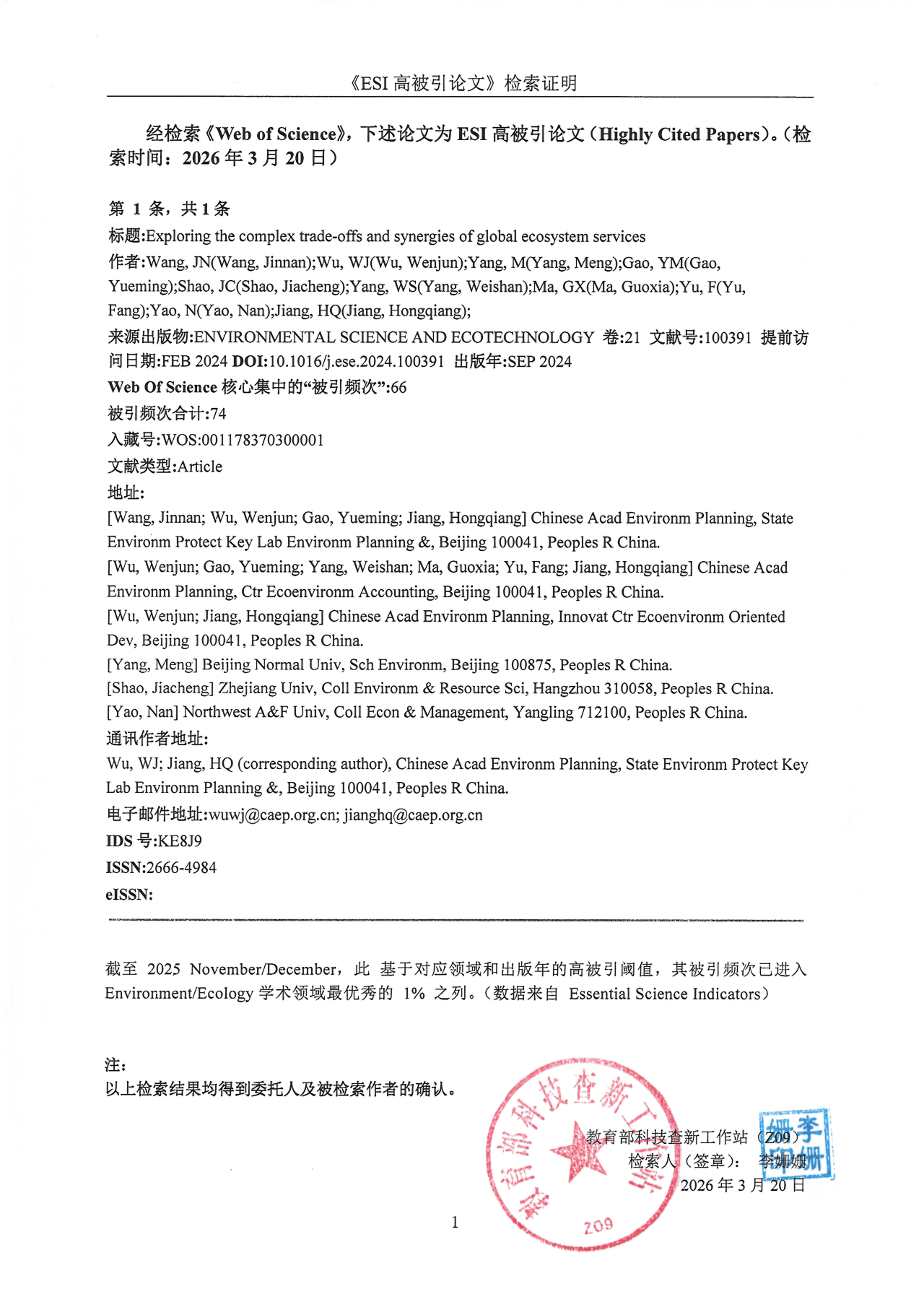 近日,国际权威学术评价机构科睿唯安(Clarivate)发布的最新ESI数据显示,生态环境部环境规划院王金南院士团队发表的论文“Exploring the complex trade-offs and synergies of global ecosystem services”成功入选2025年ESI前1%高被引论文,该论文于2024年9月发表在环境与生态领域权威期刊Environmental Science and Ecotechnology(ESE)上。