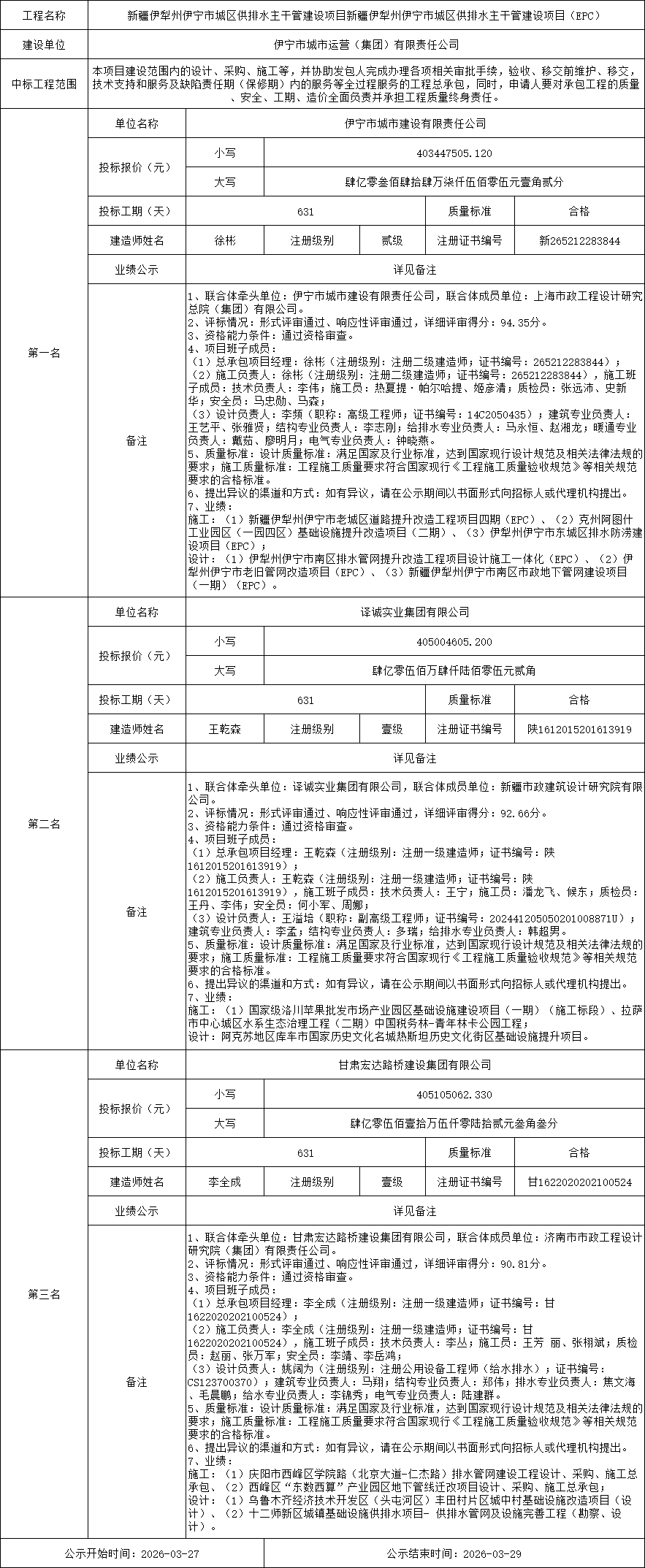 中标候选人第二名:译诚实业集团有限公司、新疆市政建筑设计研究院有限公司,投标报价:405004605.200元;