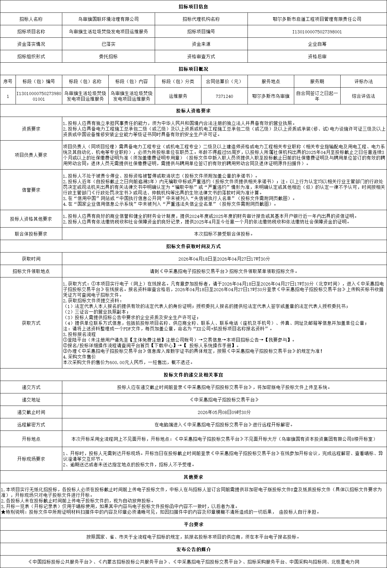 乌审旗生活垃圾焚烧发电项目运维服务招标公告