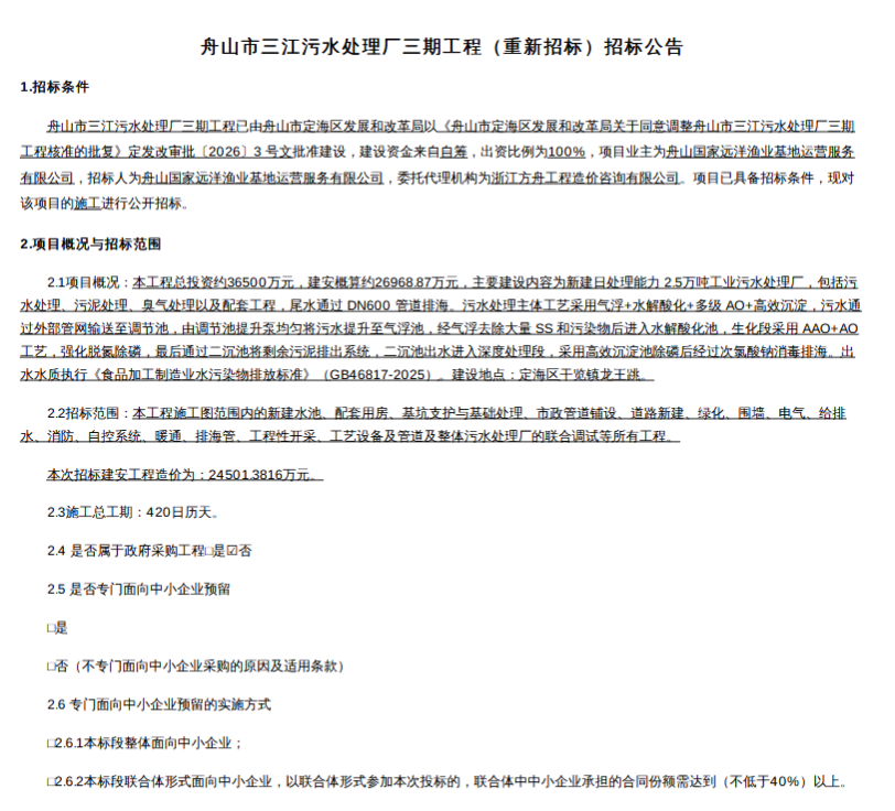 4月27日,浙江省舟山市三江污水处理厂三期工程(重新招标)招标公告发布。