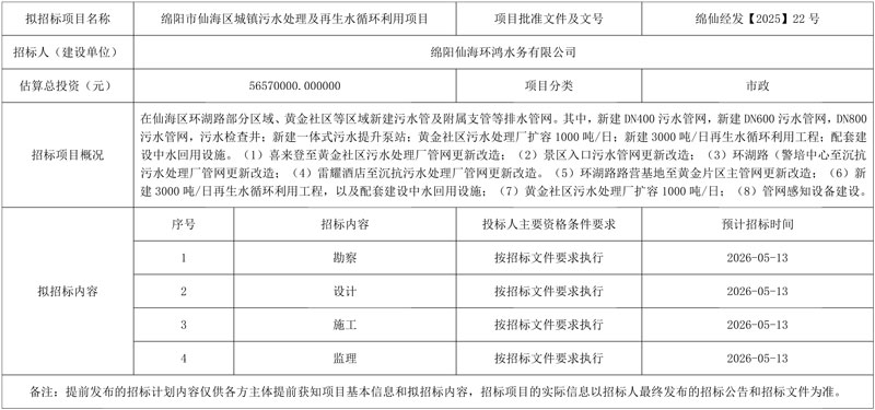 四川省绵阳市仙海区城镇污水处理及再生水循环利用项目招标计划公告发布。